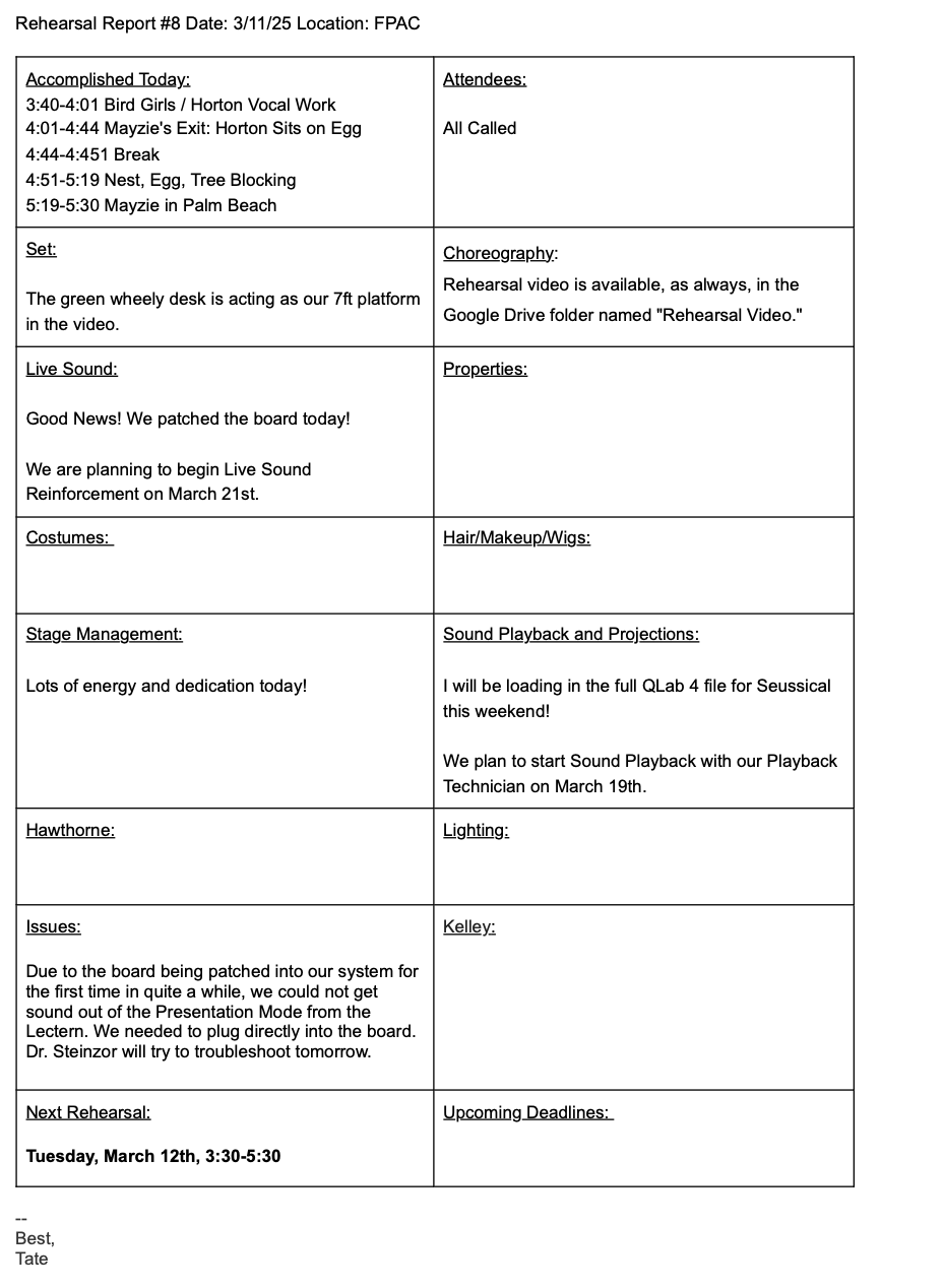 • Composing daily rehearsal reports and contributing 4K recordings of choreography for actors and designers to view