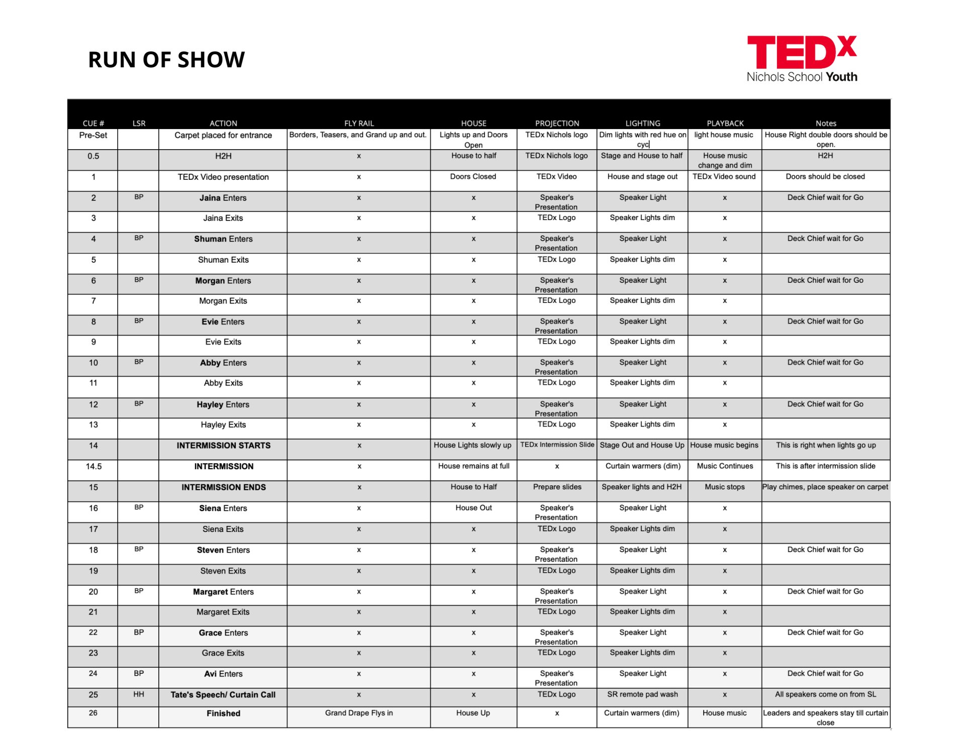 As the Stage Manager for TEDxNichols School Youth my responsibilities included: